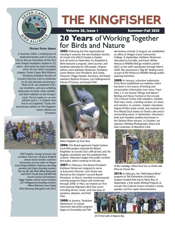 The Kingfisher newsletter is published two times a year, with summer/fall and winter/spring issues. You can receive a hard copy to read or you can find the current newsletter here.